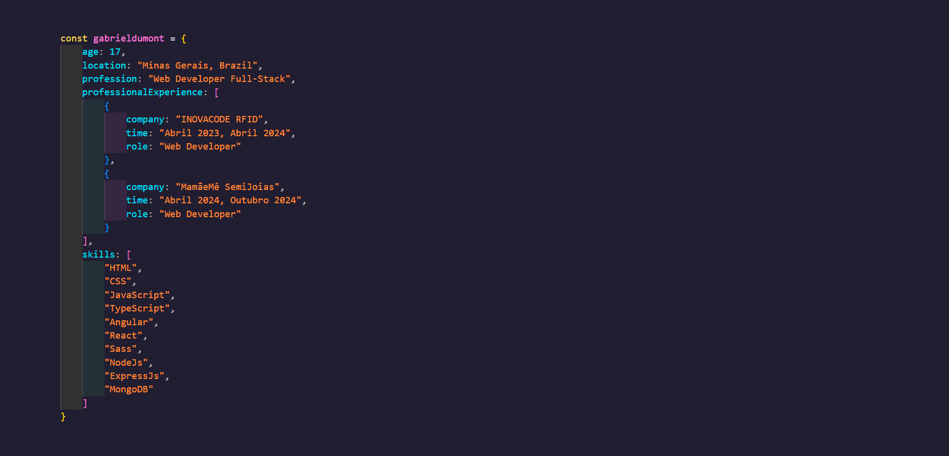 Hello! I'm Gabriel Dumont, a 17-year-old web developer from Minas Gerais, Brazil. With over a year of professional experience in the web development industry, I have honed my skills in creating web applications.