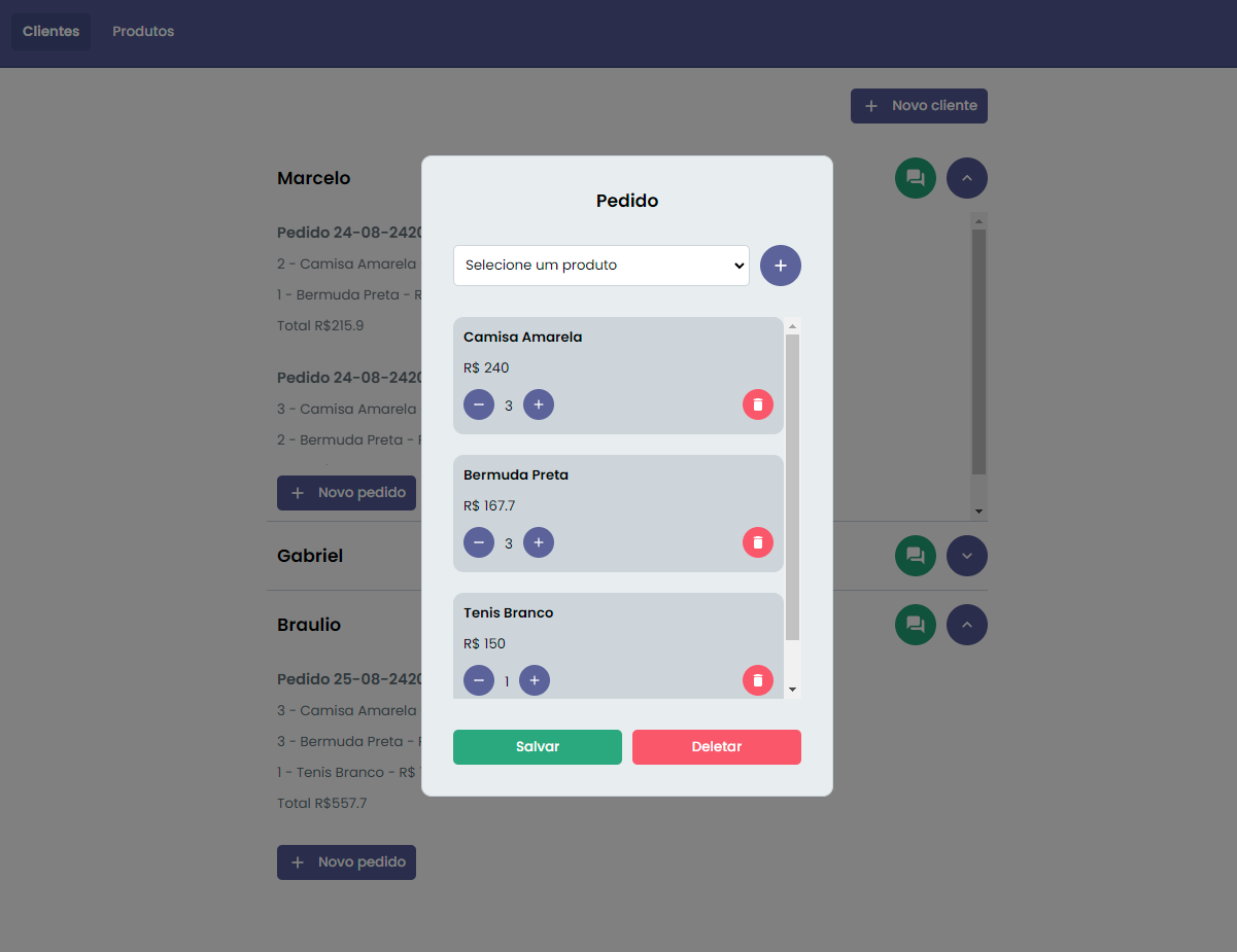 My customer management system allows users to register clients and link orders to them, providing a complete purchase history for each client. Additionally, the system enables direct access to WhatsApp conversations with clients by simply registering their phone numbers. The system also includes a product catalog for adding items to orders, streamlining the entire management process.